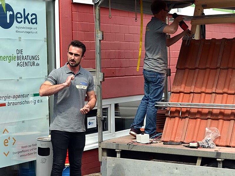 Eine beeindruckende Vorstellung geben dann unsere Monteure mit der Montage eines Schrägdachgestells einschließlich Solarmodul am Demo-Dach, welches auf unserem Anhänger auf dem Außengelände des Veranstaltungsortes stand. Unser Obermonteur Arek Kalita schildert zunächst engagiert die Vorteile des verwendeten novotegra-Montagegestells ‒ und dann geht’s los: Unsere Monteure Sebastian Hartwich und Johannes Richter führen uns die fachgerechte Montage vor ‒ und erläutern dabei auch die getrennte Verlegung der Gleichstromleitungen und den mechanischen Schutz bei der Einführung der Kabel unter die Ziegel.