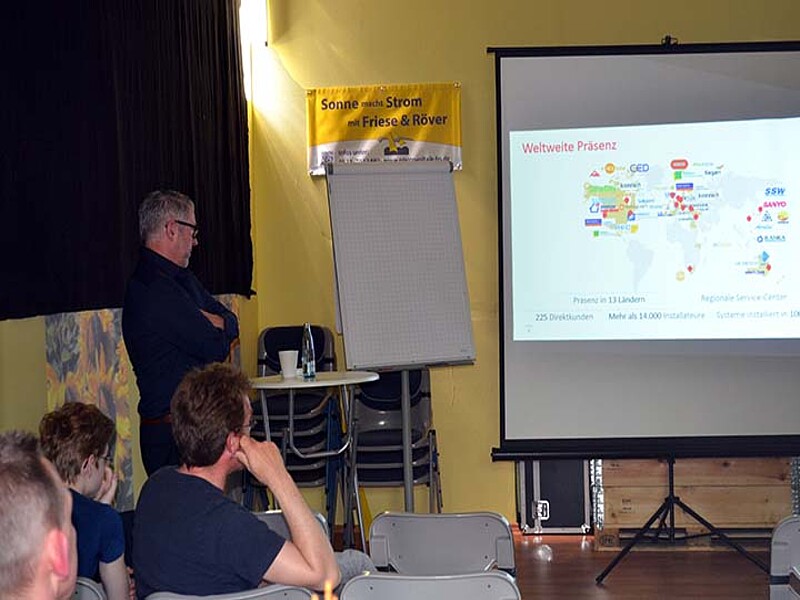 Weiter geht’s mit einem Vortrag: Uwe Janßen bietet uns eine Übersicht über das breite Produktportfolio von Krannich und erklärt die Funktionsweise des Speichers der Firma Axitec (auch bekannt als Modulhersteller mit integrierten Leistungsoptimierer).