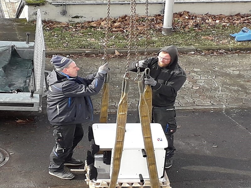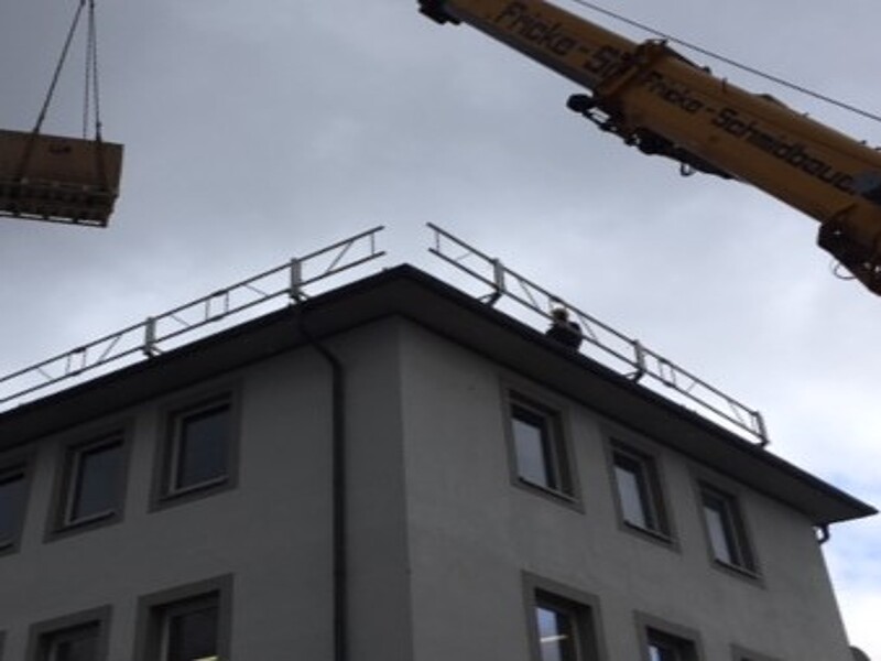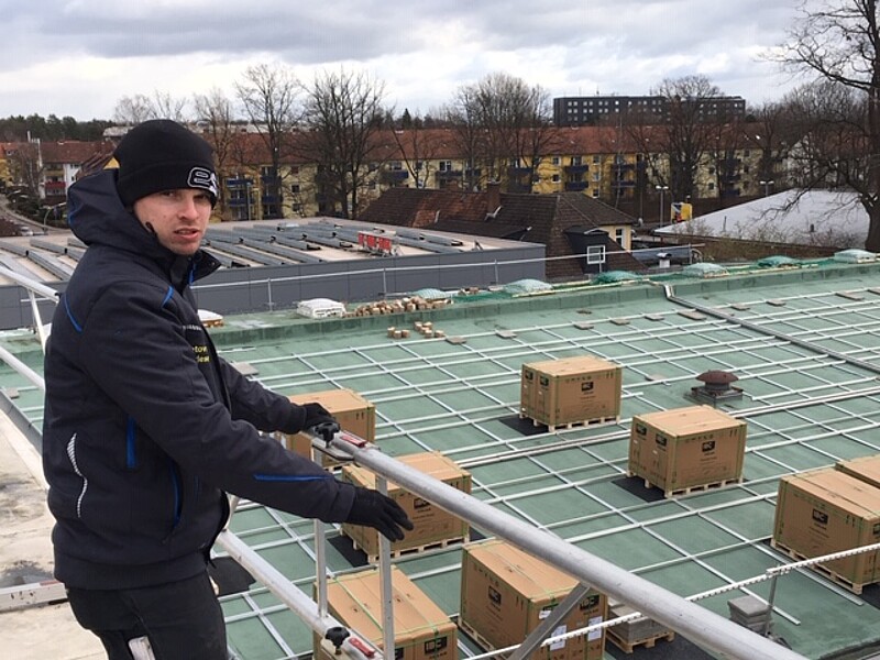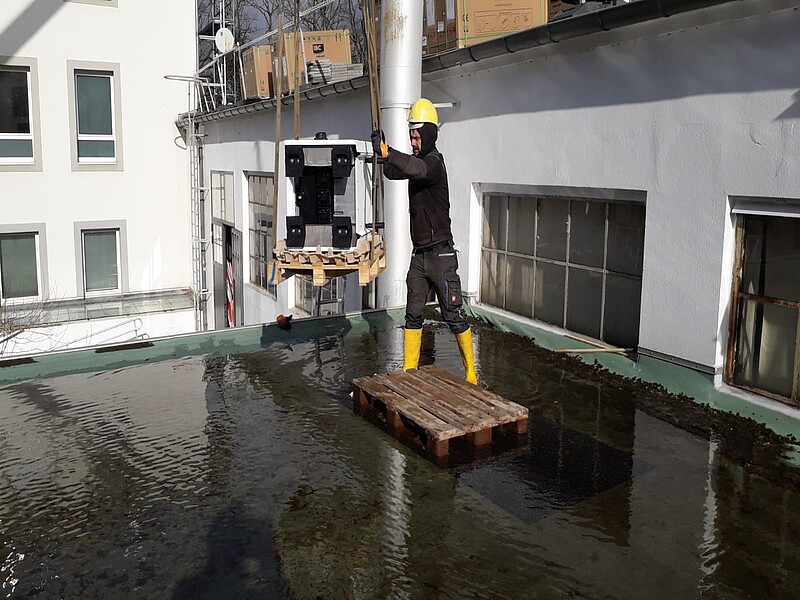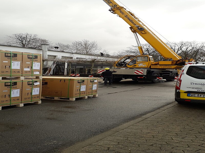 Das Wetter spielt mit, also haben wir alles auf's Dach gebracht. Super Infrastruktur vor Ort: Gabelstapler, Laubsauger, Kaffeeautomat...es fehlt an Nichts. Das Betondach dient uns als Lagerfläche, so dass die Laufwege kurz gehalten werden können. Insgesamt sind über 800 Module mit jeweils 320 Wp zu verteilen.