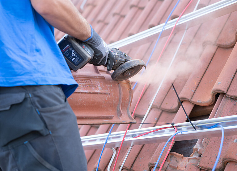 Mit einem Winkelschleifer erstellen wir die Ausschnitte in den Dachziegeln für die Dachhaken - auf keinen Fall benutzen wir dafür den Hammer (auch wenn es vielleicht schneller ginge), da wir keine (kaum sichtbaren) Haarrisse riskieren wollen.